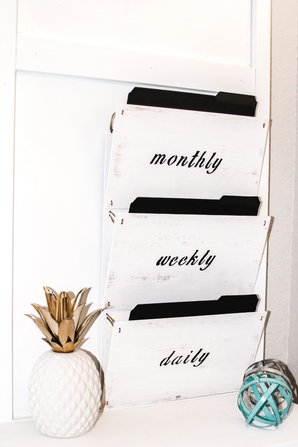 All that’s left to do is attach a bracket to your new DIY wall mounted file organizer and get to organizing your hot mess!